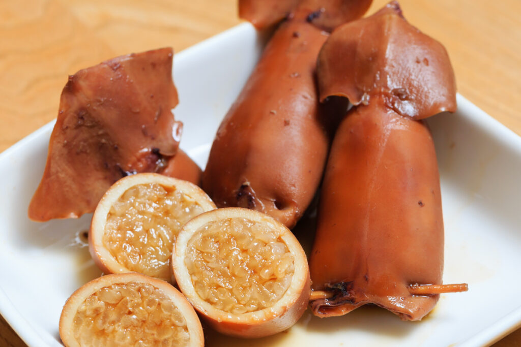 鱿鱼饭是函馆名产。在新鲜鱿鱼内填入米饭,并使用秘制酱汁焖煮而成。有真空包装版,非常适合作为伴手礼在旅行后回味。 函馆有一个响亮的鱿鱼之城称号,这份人气鱿鱼商品当然不能错过。