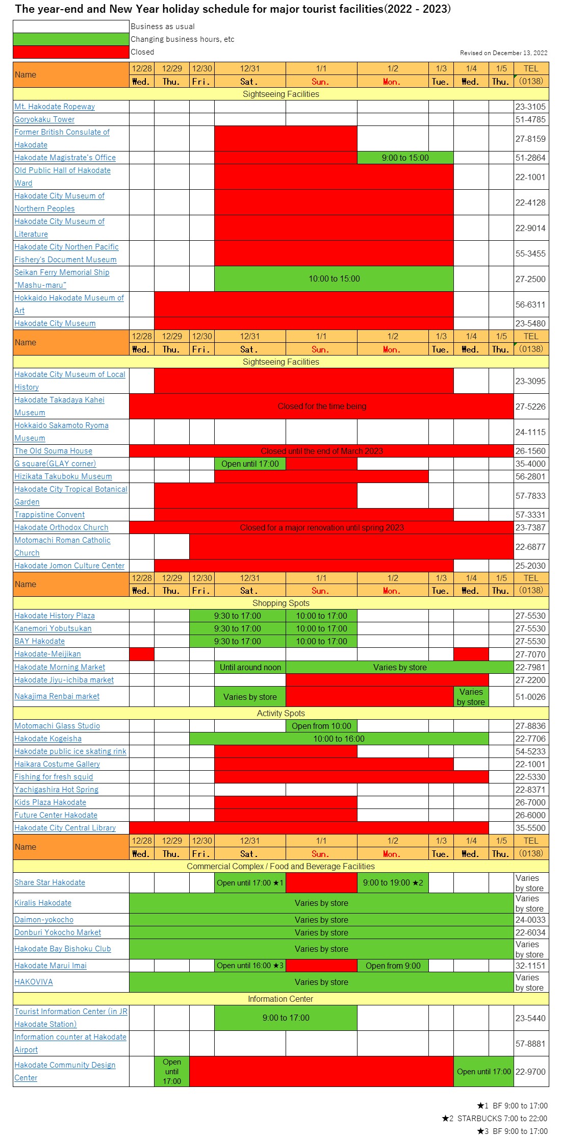 統整了函館主要觀光設施的新年營業時間。預計在這個時期前往函館的旅客歡迎多加利用。