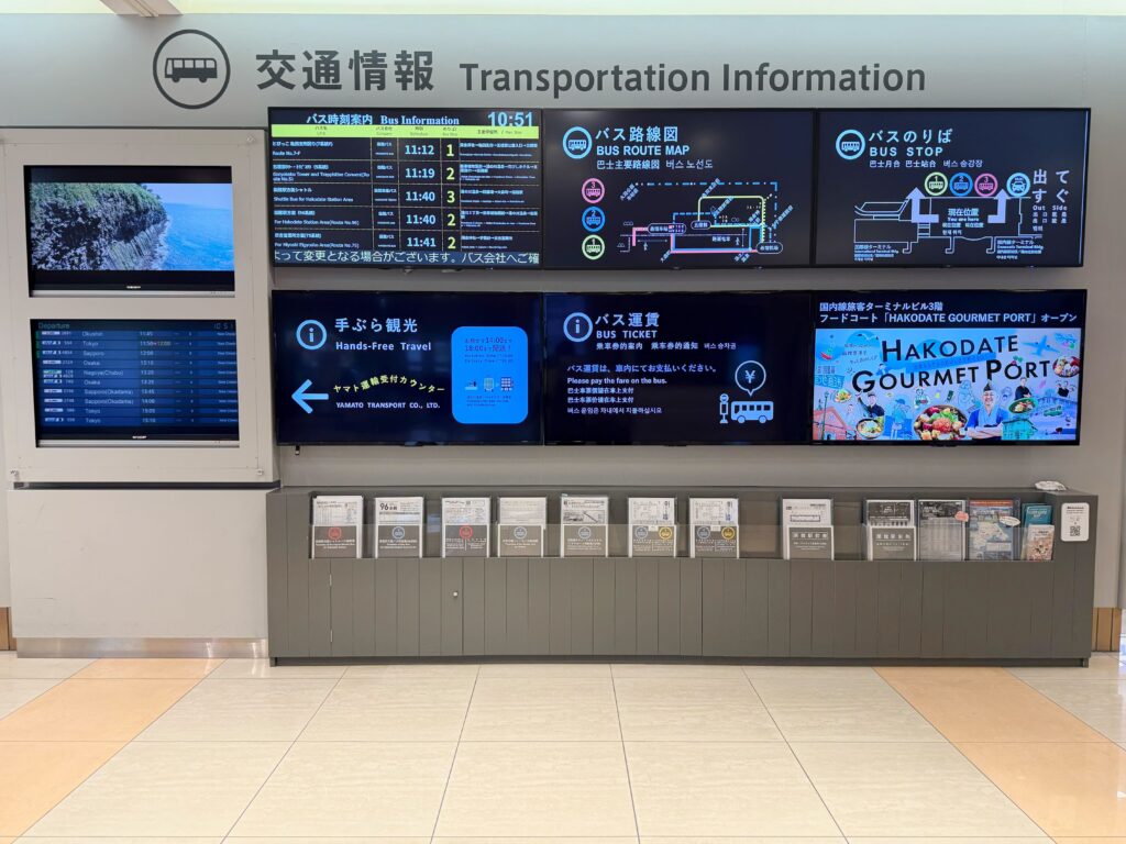 Since there is no railway service to Hakodate Airport, the main transportation options are rental cars, taxis, and the most convenient option is buses. When traveling to Hakodate Station, Hakodate Morning Market, Goryokaku, Onuma, or Shin-Hakodate-Hokuto Station, you can board a bus directly from Stops 1 to 3 located near the exit by the “Hakodate Airport Domestic Terminal” arrival lobby.