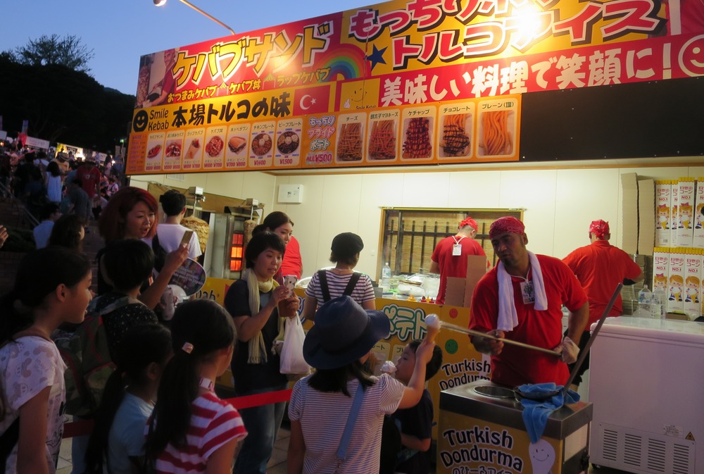 전 세계에서 모인 예술가들의 춤과 악기 연주를 즐길 수 있습니다. 미슐랭 그린 가이드 일본 편(Michelin Green Guide Japon)에서 별 두 개를 받은 공회당 앞 모토마치 공원은 수백 명의 예술가와 수만 명의 관객들로 붐빕니다. 4곳의 메인 무대 외에도 공원 안을 돌아다니며 퍼포먼스를 펼치는 예술가들도 있습니다. 이 예술제에는 세계의 음식과 요리를 즐길 수 있는 ‘모구모구 페스티벌’도 동시 개최됩니다.