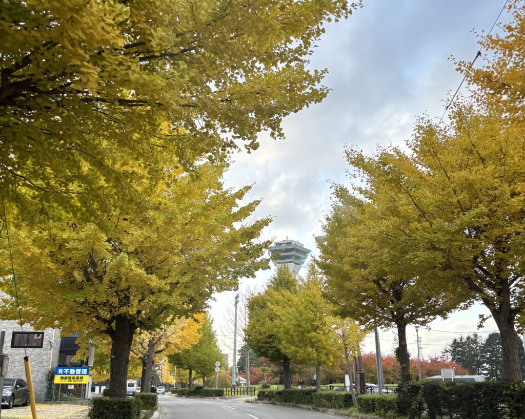 고료카쿠 공원 밖에서는 은행나무들이 황금빛으로 물들어 아름다운 가을 장관을 이루고 있습니다.