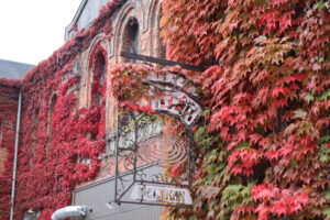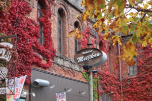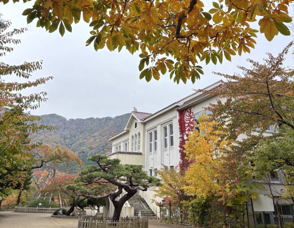 Di Hakodate Meijikan, bangunan batu bata merah menampilkan kontras yang menawan dengan dedaunan berwarna-warni.