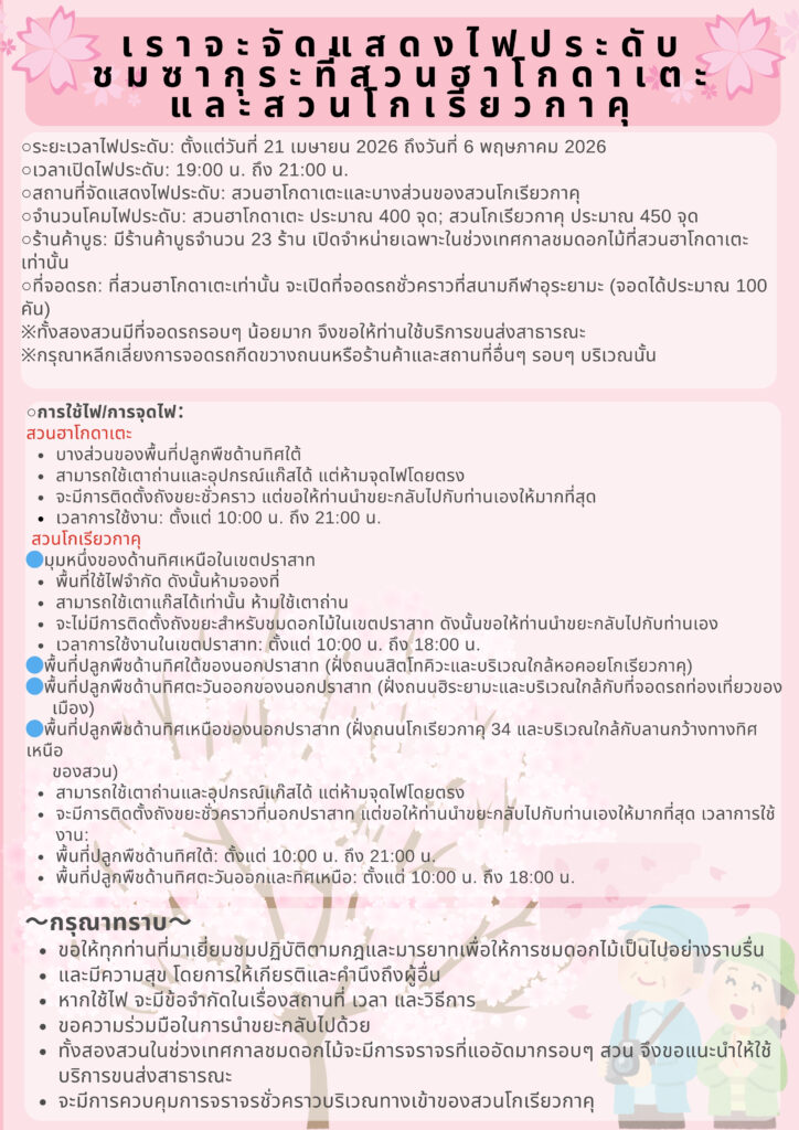 สวนฮาโกดาเตะและสวนโกเรียวคาคุจะจัดกิจกรรมชมซากุระยามค่ำคืนพร้อมไฟประดับ “ฮานามิอิลลูมิเนชัน” ตั้งแต่วันที่ 21 เมษายน ถึง 6 พฤษภาคม